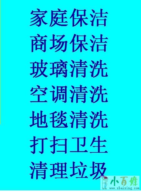 服务项目:单位开荒保洁、新居开荒、家庭保洁、清洗地毯、工程开荒保洁、定期保洁、外墙清洗保洁、外墙涂料清洗粉刷、石材翻新、石材抛光打蜡、地板打蜡抛光翻新、沙发清洗保养、家庭保洁、办公区,写字楼常规保洁、瓷砖美缝小 百 姓 网。